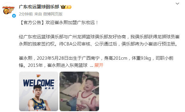 广东男篮官方公告写道:“经广东宏远篮球俱乐部与广州龙狮篮球俱乐部友好协商,我俱乐部获得龙狮球员崔永熙的独家签约权。待CBA公司审核、公示通过后,俱乐部将为小崔进行预注册。”