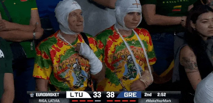 第二节比赛,镜头给到球迷看台,两名立陶宛球迷裹满纱布观战。