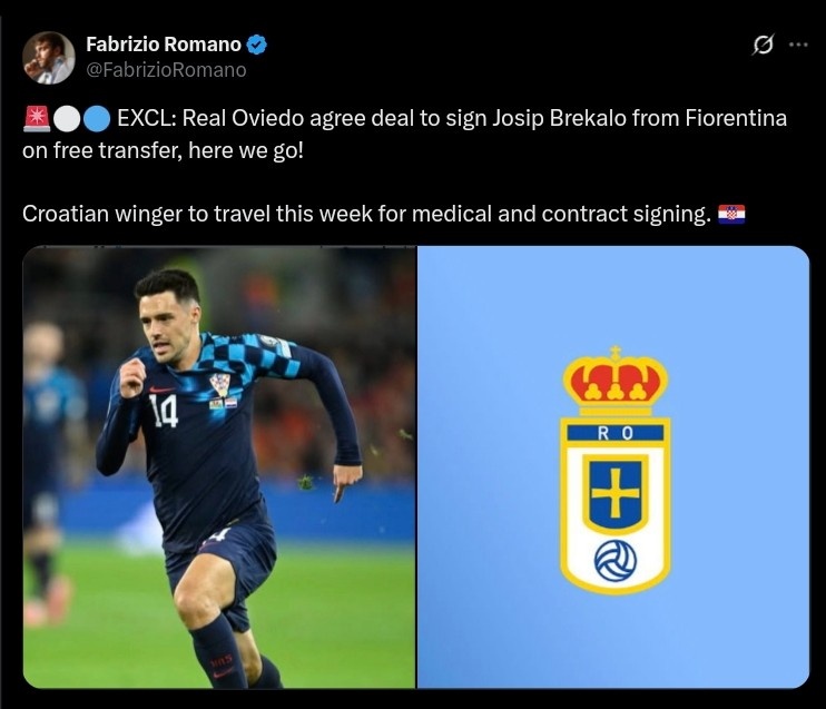 8月20日讯 据知名转会专家罗马诺报道,皇家奥维耶多将签下克罗地亚球员布雷卡洛,Here we go!
